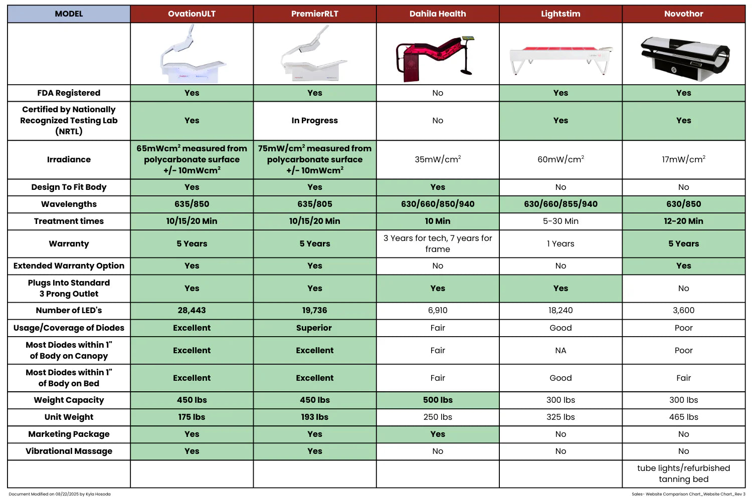 1. We offer marketing support options to help you reach potential clients! 2. One of the safest red light systems available, designed for business and client safety. 3. Designed to deliver long-term value and potential ROI with proper execution and client demand. 4. Head-to-Head comparison chart leader 5. Among leading red light wellness manufacturers in the U.S. 6 FDA registered & NRTL certified 7. 5 year warranty parts & labor 8. Price match guarantee 9 Proudly Manufactured in the USA. Prices unaffected by tariffs.